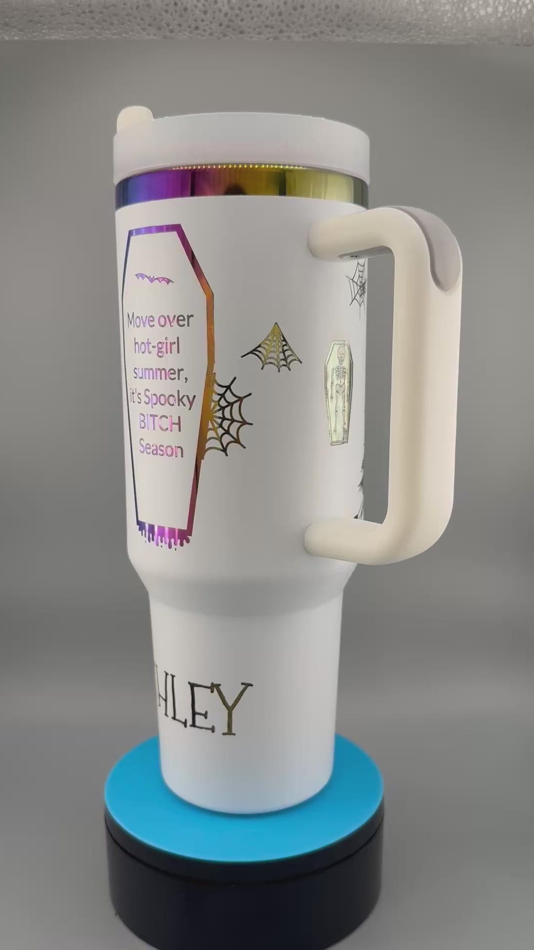 Say goodbye to sunshine and hello to spooky vibes with the 40 oz “Spooky Bitch Season” tumbler — a bold, seasonal essential for fall lovers who like their drinks cold and their style colder.